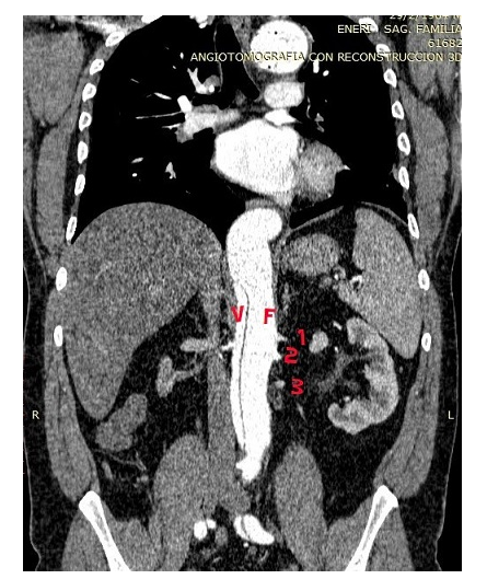 La presencia de arterias renales accesorias suele ser frecuente y en más del 70% de los casos es unilateral o doble. La disposición en forma triple, como en el caso presentado, se observa en menos del 2,5% de la población. (Figura 5)