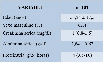 La edad media fue 53 años, 62,4% eran de sexo masculino, la creatinina al momento del estudio fue de 1(0,8-1,5) mg/dl, la albúmina sérica fue 2,84 g/dl y la proteinuria de 24 horas fue 4 (3,5-10) g/24 horas (Tabla 1).