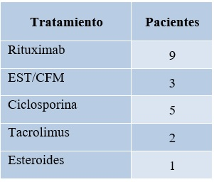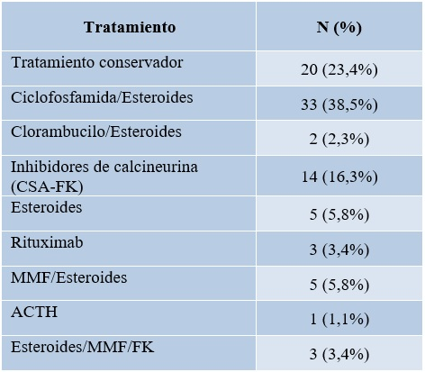 Respecto del tratamiento de los pacientes que tenían NM confirmada por biopsia (n=86) el 23,4% (n=20) recibía tratamiento conservador sin haber sido tratado con inmunosupresión; el 38,5% (n=33) había recibido tratamiento con ciclofosfamida y esteroides en meses alternos durante 6 meses, el 16,3% (n=14) recibió un inhibidor de la calcineurina (ciclosporina o tacrolimus), 2,3% (n=2) recibió tratamiento con clorambucilo y esteroides en meses alternos (ambos esquemas propuestos por Ponticelli, conocidos por el epónimo);(15) 5,8% (n=5) esteroides solos; 3,4% (n=3) rituximab, un paciente recibió hormona adrenocorticotropa (ACTH) subcutánea, 3 pacientes recibieron micofenolato mofetil, tacrolimus y esteroides, y 5 pacientes recibieron MMF y esteroides. La evolución luego del primer tratamiento se ilustra en el Grafico 2 y en la Tabla 3.
