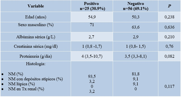 Todos los resultados son expresados como media y desviación standard y/o mediana con su rango intercuartílico (percentil 25-75) según corresponda y las variables categóricas como porcentajes. Utilizamos T test o Mann Whitney para comparar variables continuas y Chi cuadrado para las categóricas entre los grupos con anti-PLA2R positivos y negativos. Para analizar la relación entre anti-PLA2R y proteinuria utilizamos correlación bivariada de Pearson. La asociación con p=< 0,05 fue considerada estadísticamente significativa.