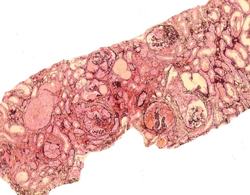 Se recibe anatomía patológica: M.O. 36 glomérulos con proliferación extracapilar en forma de semilunas (23 epiteliales y 13 fibroepiteliales) 4 con necrosis fibrinoide, Necrosis tubular aguda (NTA) 60% de los túbulos, infiltrado intersticial inflamatorio difuso. (Figura 1)