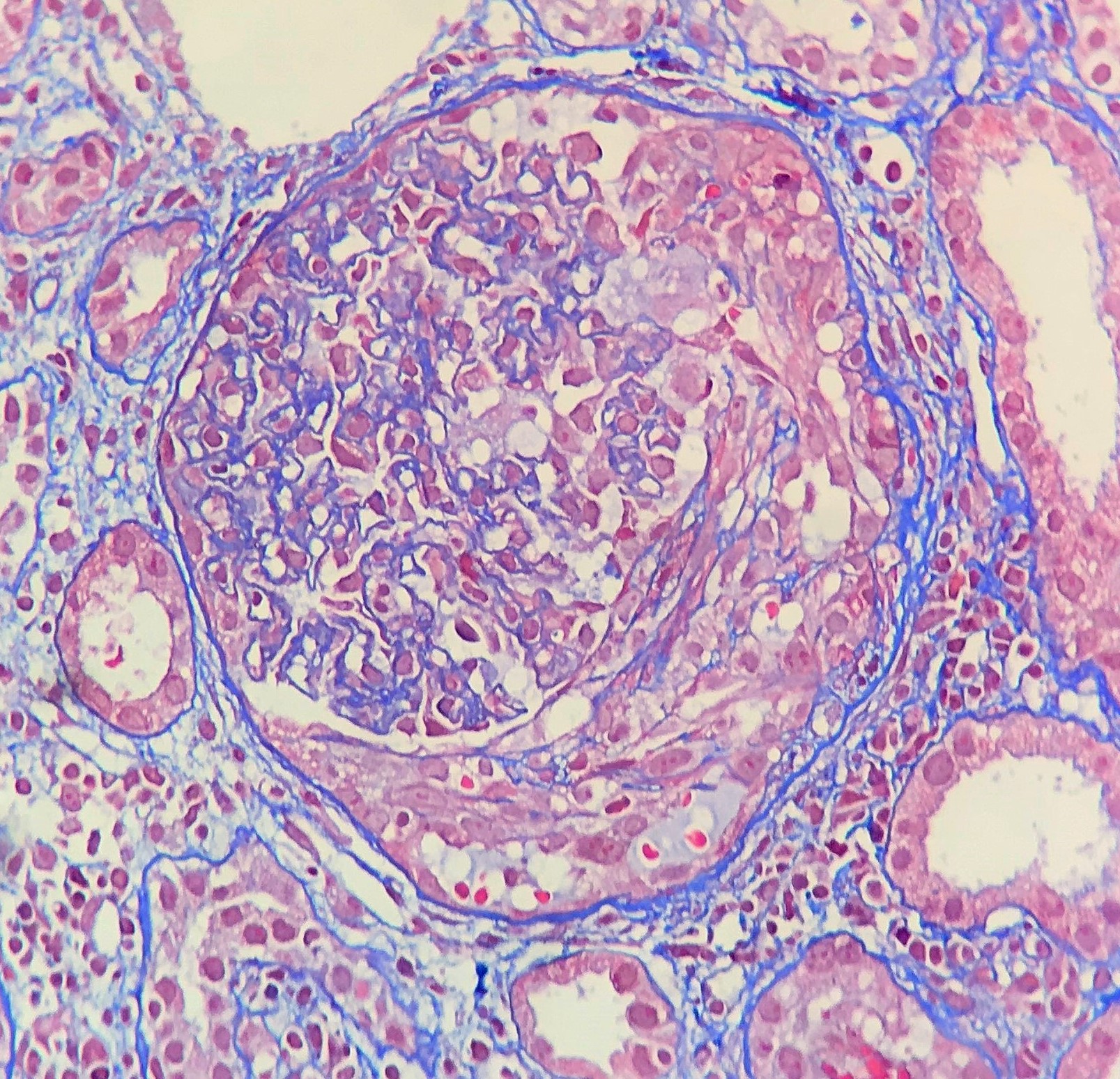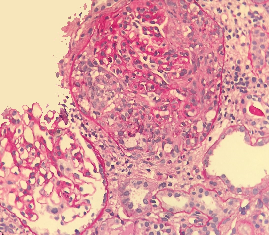 Las determinaciones de C3 y C4 fueron normales, FAN, Anti DNA, ANCA, anti MPO y PR3, y anticuerpos anti MBG negativos. Ante la sospecha de una GNRP, se realizó una PBR y e inició tratamiento con pulsos de metilprednisolona 1gr/día intravenoso (i.v.), continuando con 1 mg/kg/día vía oral (v.o.). Si bien nunca refirió ni presentó semiología respiratoria se realizó TC de tórax que evidenció aéreas parcheadas, en vidrio esmerilado peribronquiales en ambos campos pulmonares con leve derrame pleural, sin derrame pericárdico, adenomegalias y vasos con calibre conservado.