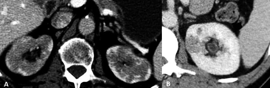 Radiológicamente, el diagnóstico diferencial también es amplio y depende de la morfología de las lesiones en la prueba de imagen. Así, cuando la afectación renal es nodular y bilateral, el diagnóstico diferencial hay que realizarlo con lesiones metastásicas, linfoma, pielonefritis bilateral y embolismo séptico, entre otros. Si es una lesión única unilateral tipo masa puede simular un carcinoma de células renales y si se manifiesta como un engrosamiento focal en la pelvis puede simular un carcinoma de células transicionales. Si la lesión tiene una morfología en cuña puede similar un foco de pielonefritis único o incluso un infarto renal.(9)