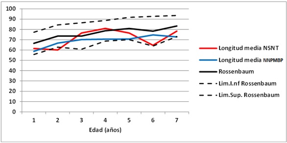 NNPMBP: Niños nacidos prematuros muy bajo peso. NSNT: Niños sanos nacidos a término. Trazados de las medias de longitudes promedios de ambos riñones de niños nacidos prematuros extremos, de NSNT y de las de curvas de Rosenbaum Media ± 2DS curva Rossenbaum. Los NNPMBP tienen valores de L mayores que los NSNT hasta los 2a 6m, luego se ubican por debajo del trazado de NSNT y en el límite inferior de las curvas de Rosenbaum, hasta los 7 años.