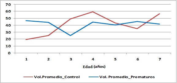 La media del V fue superior al VP, hasta los 2a 6m y desde esa edad se situó por debajo de la media de V de NSNT y de la media de VP. El trazado de las medias del VR se situó por arriba del trazado del límite superior del IC95% del VP, hasta la edad de 6a. Se calculó el porcentaje de prematuros con volúmenes inferiores al volumen promedio de NSNT. 47% de los prematuros tuvieron V inferiores a los NSNT y 27% del VP. (Tabla 2)