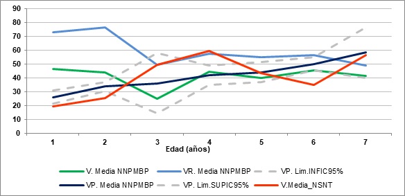 NNPMBP: Niños nacidos prematuros muy bajo peso al nacer. NSNT: Niños sanos nacidos a término. Trazados de las medias de volúmenes promedios de ambos riñones en NNPMBP y NSNT. Los NNPMBP tuvieron volumen renal promedio mayor que NSNT hasta los 2 años 6 meses. Desde esa edad a los 7 años, el volumen de NNPMBP disminuye. 47% tuvieron valores de V menores a NSNT. Ver Tabla 9.