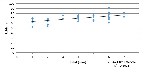 La longitud media está linealmente asociada a la edad (r=0,60; R2=36%). (p<0,0001). El 7% de los cambios de la longitud promedio se debería a la edad