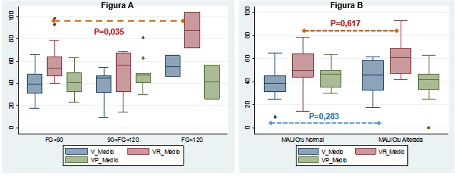 En el eje de las Y de ambas figuras las unidades son diferentes: para V y VP se expresa en cm3 y VR en cm3/m2. Sin embargo, la escala es la misma del 0 al 100. A) FG: filtrado glomerular. V medio: volumen promedio. VR medio: volumen relativo promedio. VP medio: volumen predictivo promedio. La diferencia del VR promedio fue significativamente diferente entre los grupos < 90 y > 120 (ANOVA p=0,0353); B) MAU/Cru: Microalbuminuria/creatininuria urinaria. Tanto el V como el VR fueron mayores en el grupo con MAU/Cru alterada, pero sin diferencias significativas. p=0,283 y p=0,617