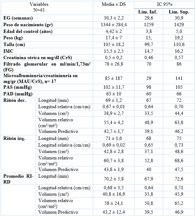 Los criterios de inclusión fueron: EG ≤ de 32 s, PN ≤ de 1500 g, edad ≥ de 1 año(a) y ≤ 7 (a) al momento del control, tener registradas en la misma fecha las medidas antropométricas, PA y haber cumplimentado con los estudios de laboratorio y sonografía renal. Se excluyeron anomalías urológicas y/o renales. Los datos se tomaron de las historias clínicas del consultorio. Se incluyeron NSNT a los que se realizó ecografía en el mismo servicio, con el mismo operador que los prematuros, de semejante edad. Se usaron datos de edad y medidas renales absolutas. Por falta de datos antropométricos, peso y talla (T) en la ficha del servicio no se pudieron calcular medidas relativas en el grupo control.