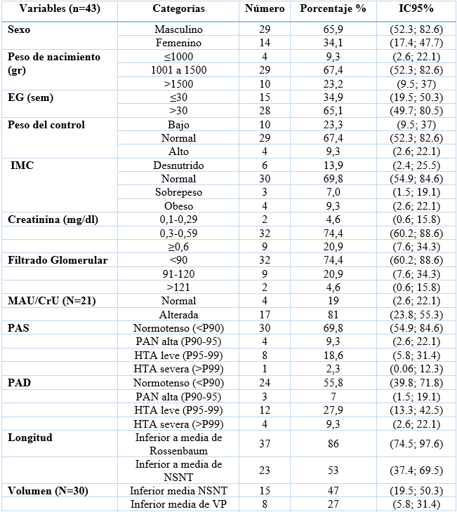 Las variables cuantitativas se analizaron como variables continuas y categorizadas. Se agruparon: la EG en ≤ 30s y > de 30s; el PN, en >1000g a ≤ de 1500g y ≤ de 1000g. La CrS (mg/dl) según valores: 01-0,3; >0,3 a ≤0,6, >0,6. El FG en normal (90-120), disminuido <90 e hiperfiltrado > 120. Relación MAU/CrU normal ≤ de 30mg/gr, alterado por encima de ese valor.