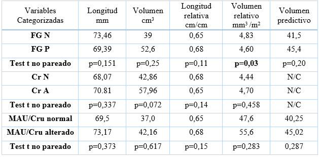 Para estudiar la asociación entre las medidas renales y todas las variables consideradas se usaron las medias de las medidas renales combinadas (RD y RI). En la Tabla 3 se observan resultados de Test no pareado. Se encontró asociación entre VR y FG alterado, menor VR en FG alterado (p=0,03).