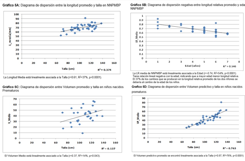 La LR media de NNPMBP está linealmente asociada a la edad (r=0,74, R2=54%, p<0,0001). Tiene relación lineal negativa con la edad, indicando que a mayor edad menor longitud relativa. El 37% de los cambios que se producen en la longitud relativa promedio de dos riñones se debería al cambio de la edad de los niños.