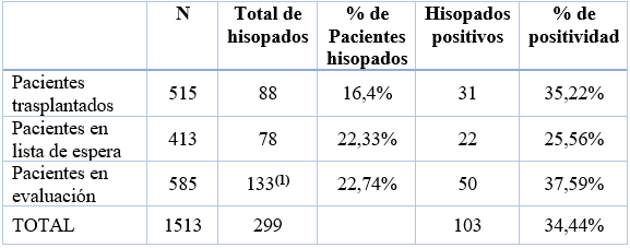 El 6,01% de los trasplantados, el 5,3% de los pacientes en LER y el 8,03 % de los pacientes en evaluación tuvieron hisopado positivo.