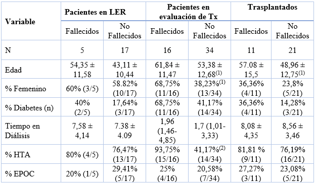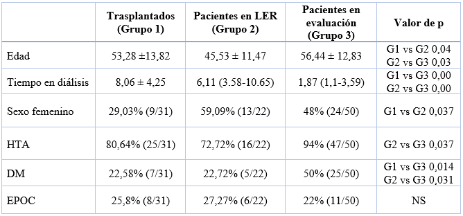 No se encontraron diferencias estadísticamente significativas entre aquellos en lista de espera. Se observó una proporción significativamente mayor de mujeres e hipertensos entre los fallecidos en evaluación para trasplante, pero estas diferencias no se encontraron en los otros grupos (trasplantados o en LER). El menor tiempo en diálisis observable en aquellos pacientes en evaluación se explicaría por su reciente ingreso en tratamiento sustitutivo para definir su aptitud para ser incorporados o no en lista de espera.
