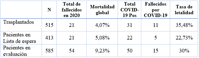 En nuestra población se observó una tasa de infección por COVID-19 entre el 5% (pacientes trasplantados) y el 8% (grupo de pacientes en evaluación), con una tasa de positividad de los hisopados en promedio del 34,44%.
