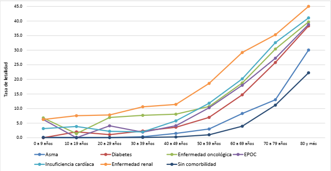 La vigilancia epidemiológica es primordial en época de pandemia, en población general y en poblaciones específicas. Las enfermedades no transmisibles (ENT) fueron foco a nivel global por su mayor incidencia y mal pronóstico.(10) En nuestro país, desde el inicio se incluyeron a las ENTs en el relevamiento de las personas con sospecha de COVID-19 registrado en el Sistema Nacional de Vigilancia en Salud (SNVS 2.0) y específicamente enfermedad renal crónica sin diálisis (ERC) y a las que requieren diálisis crónica (DC). Este relevamiento se usa como insumo diario para la detección y seguimiento de casos, articulando con los Comités Operativos de Emergencia (COE) provinciales. Del análisis surgido de los mismos, se observó que la presencia de ERC sin requerimiento de diálisis, autorreferida al momento del diagnóstico de COVID-19, a seis meses de haber comenzado la pandemia en nuestro país, presentaba una letalidad de 26,1%, vs. 0,6% en la población sin comorbilidades, con un OR de 16,4 (IC95% 15,1-17,7), siendo una de las ENTs con mayor letalidad en nuestra población en todos los grupos etarios.(11) (Graficos 1. 2)