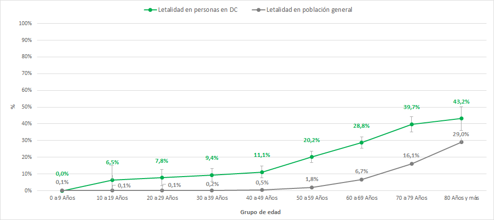 Con respecto al segmento de DC, se observa una incidencia de COVID-19 que duplica la de la población general y la letalidad es 10 veces superior, siendo significativa en cada segmento etario.(12) (Grafico 3)