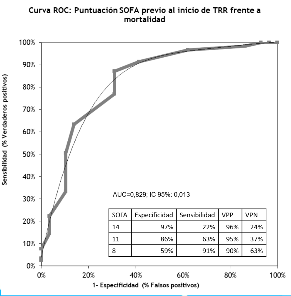 El PAIER coordinó un estudio colaborativo multicéntrico, que incluyó casos con IRA que requirieron diálisis en diecinueve hospitales públicos como centros centinelas. Sobre 3.442 casos confirmados e internados por COVID 19, observó una incidencia de IRA con requerimiento de diálisis del 7,48%, 21,3% y 31,3% de las personas internadas en general, internadas en áreas críticas y de las que requirieron asistencia respiratoria mecánica, respectivamente. Hubo una mayor necesidad de TRR en pacientes mayores, con diabetes, con ERC previa y con cobertura pública exclusiva. Las personas internadas con requerimiento de TRR tuvieron una mortalidad significativamente superior que las internadas sin requerimiento de TRR (77,4% vs. 35,9%, p=<0,001) y presentaron una internación más prolongada (14,5 días ± 8-22 vs. 10,0 días ± 5-14, p=<0,001). La vulnerabilidad marcó significativamente también la mortalidad, especialmente en personas con cobertura pública exclusiva y en personas autopercibidas como de pueblo originario. El sistema de puntuación de SOFA fue un buen predictor de mortalidad en segmento poblacional, área bajo la curva ROC (Receiver Operating characteristic) = 0,829; IC 95%: 0,013. (Grafico 4)