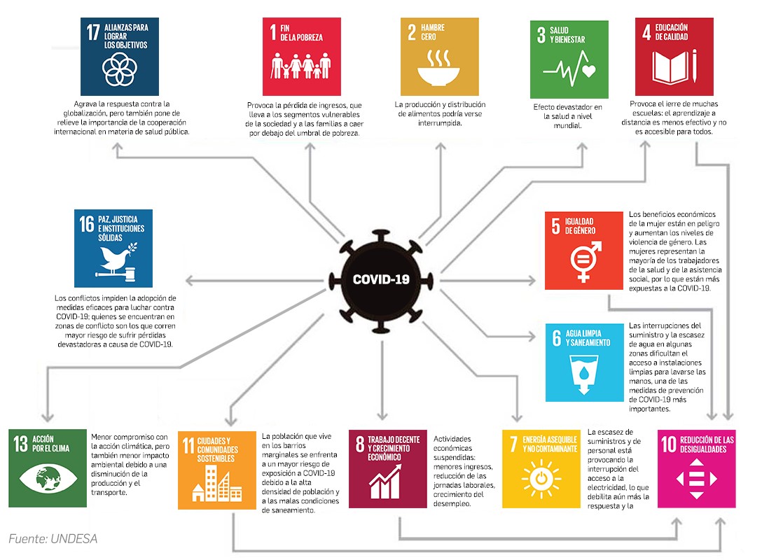 El impacto de la pandemia sobre las enfermedades no transmisibles no se reduce a los efectos de la enfermedad viral sobre los sujetos, sino también al impacto que tienen las diferentes medidas sanitarias en este grupo poblacional, la Interrupción de servicios, reasignación de personal hacia la asistencia COVID y el aplazamiento de las pruebas de detección.(21-22) Las ENTs son las causantes de 3 de cada 4 muertes en nuestra sociedad y la búsqueda activa para la detección oportuna, el control y seguimiento centrado en la persona podría mejorar los resultados de estas. Según el consenso firmado en 2015 en la Organización de Naciones Unidas, todos los estados participantes se comprometieron a realizar acciones estratégicas nucleadas en 17 Objetivos de Desarrollo Sustentable (ODS). El resultado obtenido hasta 2019 en busca de los ODS, fue atravesado por la pandemia en el último año, aumentando los índices de pobreza e impactando negativamente en los indicadores relacionados a trabajo, educación y salud (Grafico 5).(23-25)