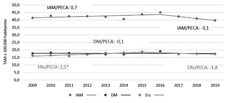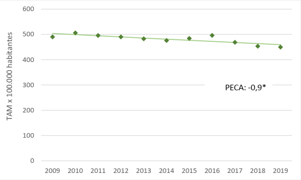 Con respecto al ODS número 3 (Salud y Bienestar), se busca la reducción de un 30 % la mortalidad por ENTs a 2030. Hasta 2019 inclusive, en Argentina se observaba con una reducción en la mortalidad por ENTs en casi 1% anual en forma sostenida en la última década (Grafico 6) y esto se daba en casi todas las enfermedades incluida las renales. (Grafico 7)