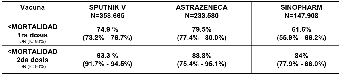 Desde las primeras publicaciones sobre vacunas contra SARS-CoV-2 se observó una alta eficacia en términos de reducción de mortalidad e internaciones en población general, superando la mayoría de las formulaciones el 80% de eficacia en estos indicadores.(18-19) En Argentina recientemente se han informado resultados similares en personas con 60 años o más.(20) (Tabla 1)