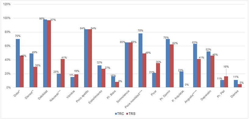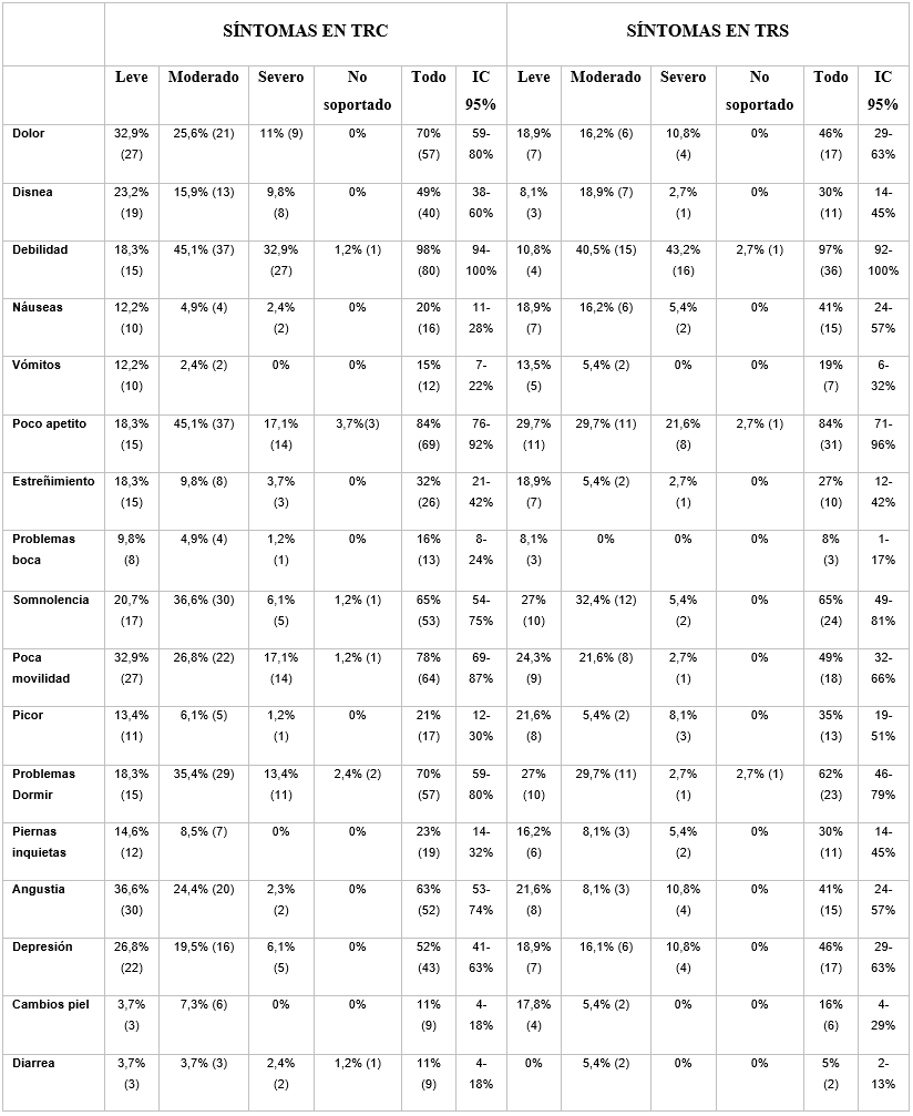 En TRC, destacan la dificultad en la movilización: 78% (IC: 69-87%) consistente con los resultados obtenidos en la escala de Karnofsky; problemas para dormir: 70% (IC: 59-80%); tendencia a la somnolencia: 65% (IC: 54-75%) y síntomas relacionados con la esfera emocional: angustia 63% (IC: 53-74%) y depresión 52% (IC: 41-63%), con una intensidad percibida como moderada. También en TRS fueron muy prevalentes la somnolencia: 65% (IC: 49-81%) y los problemas para dormir: 62% (IC: 46-79%).
