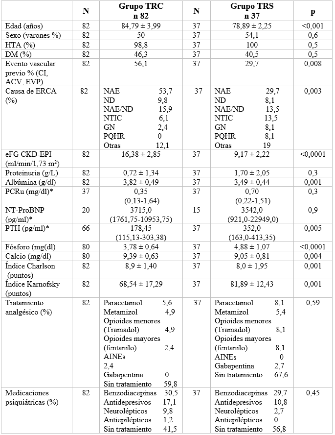 Las características basales de los pacientes en ambos tratamientos se recogen en la Tabla 1. Los pacientes en TRC tuvieron una edad media de 84,79 ± 3,99 años, mayor que la del grupo de TRS, con edad media de 78,89 ± 2,25 años (p=<0,001). Asimismo, se caracterizaron por tener elevada comorbilidad: mayor prevalencia de evento vascular previo que los pacientes en diálisis (56,1% TRC vs 29,7% TRS p=0,008), una puntuación más elevada de Charlson (8,9 ± 1,40 puntos TRC vs 8,0 ± 1,95 puntos TRS p=0,001) y un predominio de nefroangioesclerosis (NAE) y nefropatía diabética (ND) como causas de ERCA (p=0,003). La situación funcional también mostró mayor nivel de dependencia para pacientes en TRC (Karnofsky 68,54 ± 17,29 puntos TRC vs 81,89 ± 12,43 puntos TRS). No hubo diferencias entre los dos grupos en la toma de fármacos para el dolor y tratamiento psicológico (p=0,59 y p=0,45, respectivamente).