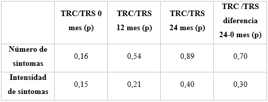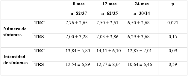 A lo largo del seguimiento, el número de síntomas fue disminuyendo en pacientes en TRC, especialmente en etapas finales (p=0,021), mientras que se mantuvo estable y sin cambios en TRS (p=0,15). La intensidad de los síntomas se mantuvo estable en ambos grupos de tratamiento. (Tabla 3)