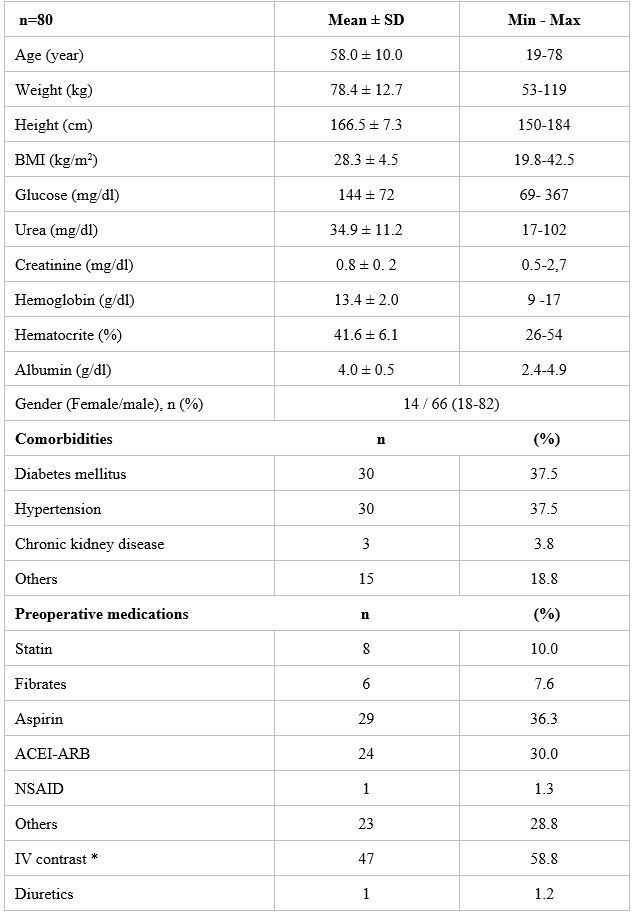A total of 80 patients (mean age 58.0 ± 10.0 years, 66 men, 14 women) were included in the study. Demographic and clinical data, drugs they use, and their preoperative tests are presented in Table 1. None of the patients died in the perioperative and postoperative period. Intraaortic balloon pump was used only in 2 of the patients. In the last three months, the rate of patients using angiotensin-converting enzyme (ACE) inhibitors or angiotensin receptor blocker (ARB) was 30%, while those using aspirin was 36.3%. The rate of preoperative contrast exposure (all given during coronary angiography) was 58.8%. (Table 1)