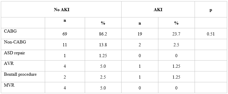 CABG was performed in 69 (86.2%) patients and different cardiac operations were performed in 11 (13.8%) cases (Table 2). AKI development rate was not significantly different according to the type of surgery.