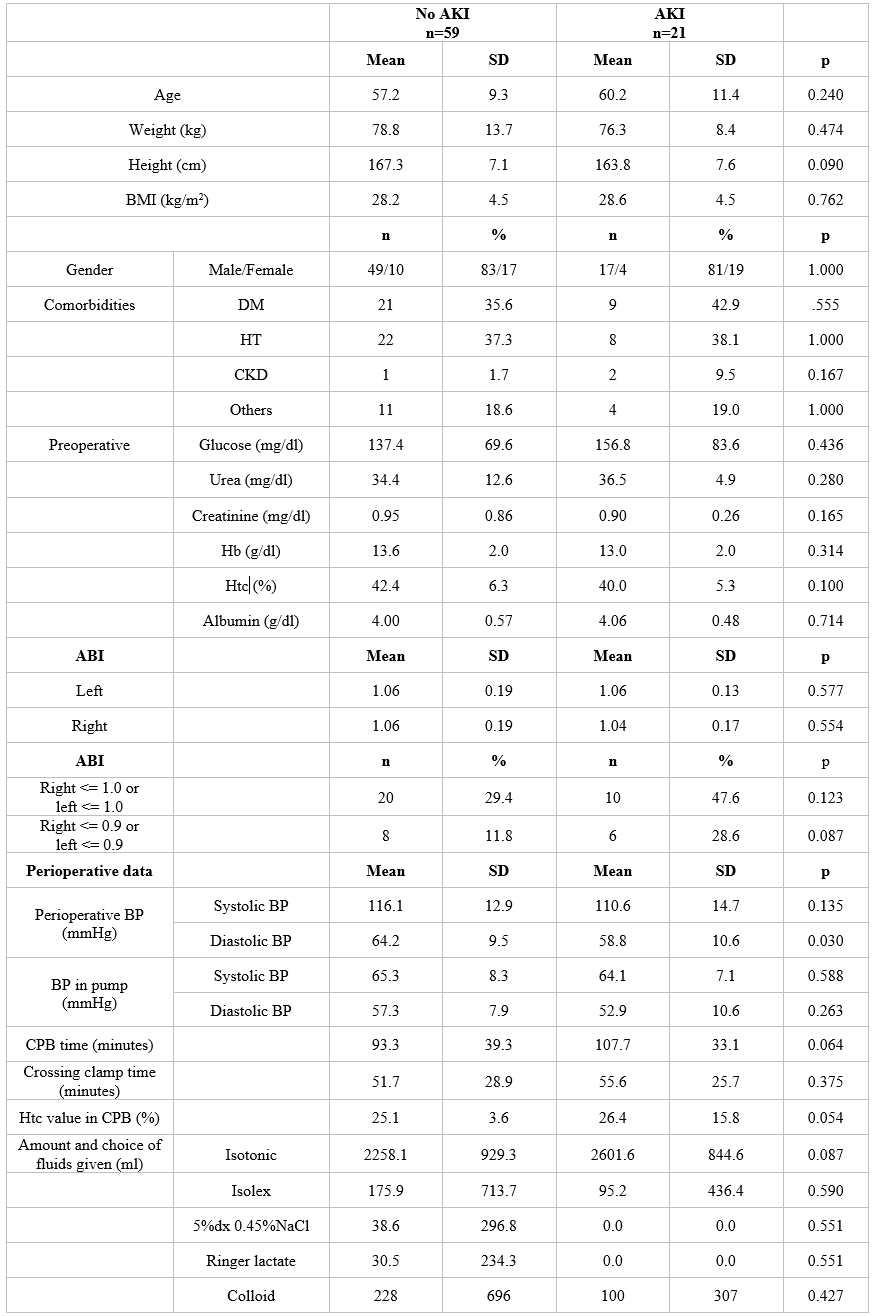 ABI: Ankle-brachial index; AKI: Acue kidney injury; BMI: Body mass index; BP: Blood pressure; CKD: Chronic kidney disease; CPB: Cardiopulmonary bypass; DM: Diabetes mellitus; FFP: Fresh frozen plasma; Hb: Hemoglobin; HT: Hypertension; Htc: Hematocrit; SD: standard deviation