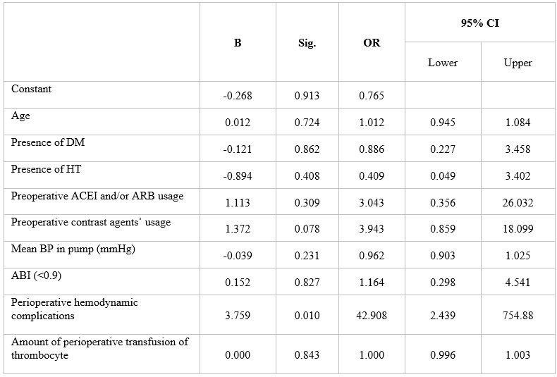 Our multivariate analysis model created for the analysis of factors determining AKI development was created (Table 4). ABI value (abnormal: <0.9 or normal >0.9) was also added to this model. In this model, only perioperative complication development was found to be related to postoperative AKI. ABI value was not significant.