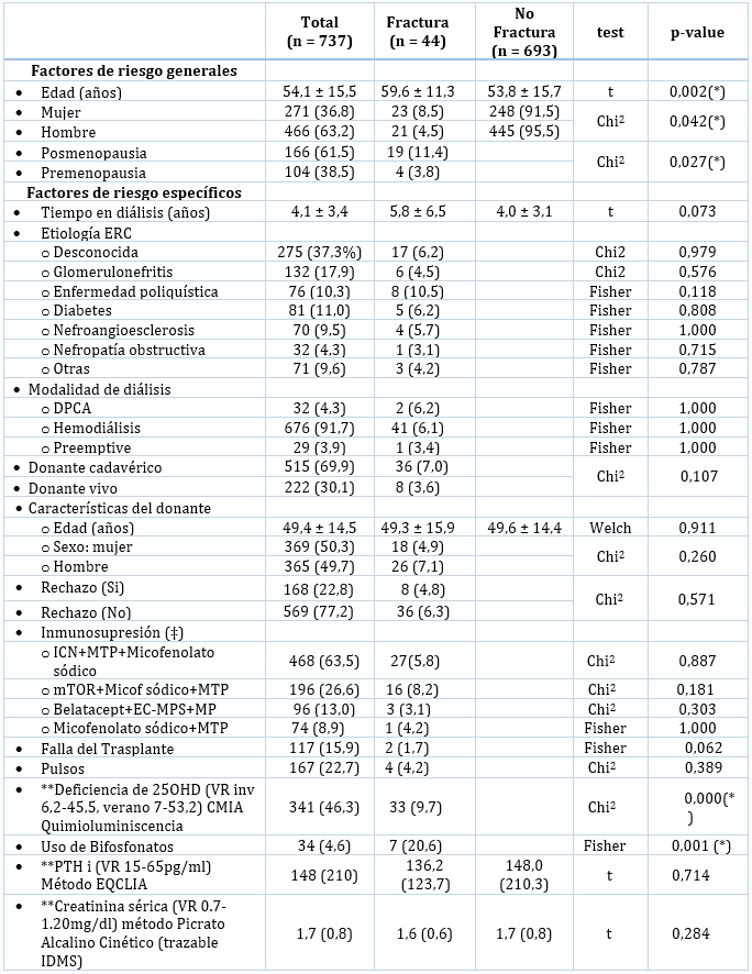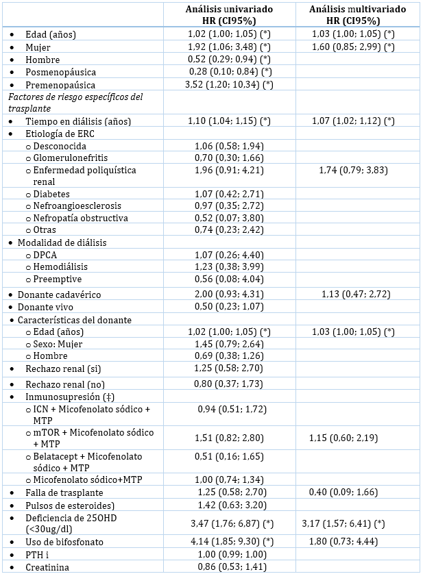 Los factores de riesgo generales asociados a riesgo de fracturas fueron: mayor edad del receptor, sexo femenino y pacientes postmenopáusicas, mientras que los factores específicos se relacionaron con el tiempo en diálisis, edad del donante, deficiencia de 25OHD y uso de bifosfonatos. (Tabla 2)