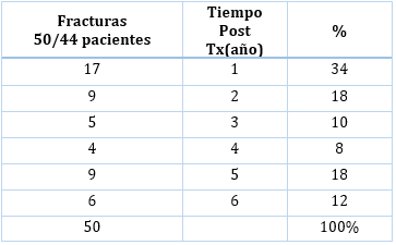 La incidencia acumulada fue de 5,97 fracturas / 1.000 personas / año (5,97 = 44 / 737 (total) / 10 (años de seguimiento) * 1.000 personas) Discriminado por sexo Femenino = 8,49 = 23/271/10 *1000