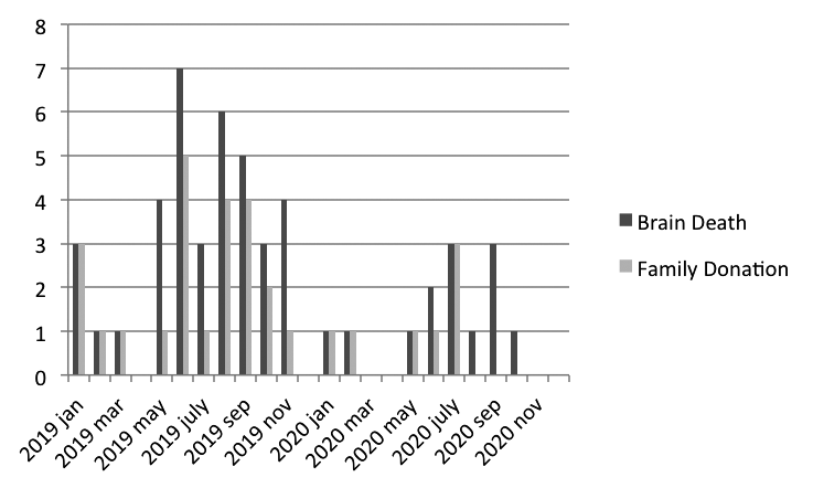 In this study, where we examine the effects of COVID-19 on brain death and organ donation, when we look at the number of brain deaths (B.D.) and family donations(F.D.) in March, April and May 2020, which are accepted as pandemic months in our country; respectively March (B.D:0, F.D:0), April (B.D:0, F:D:0) and May (B.D:1 - 0.81 PMP,F.D:1). In the same months of 2019, it was March (B.D:1- 0.81 PMP, F.D:1), April (B.D:0, F.D:0) and May (B.D:4-3.25 PMP, F.D:1), respectively. The distribution of the number of brain deaths and organ donations for the months of 2019-2020 is shown in Figure 1. When it is examined in other months, it is seen that the effect of the pandemic on brain death and organ donation continues not only in the months when the pandemic is intense, but also in other months.