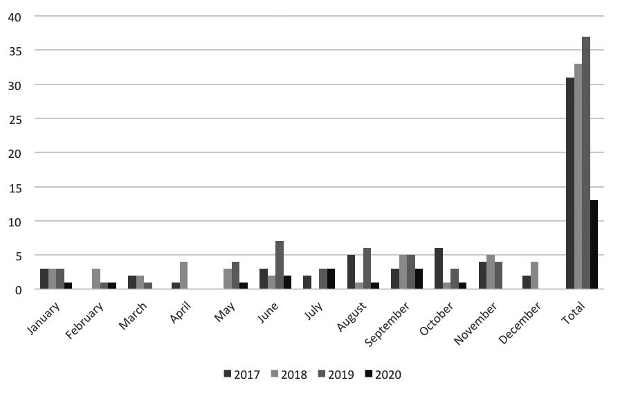 When we examine the years of 2017 and 2020, the annual total number of brain deaths is as follows: 2017 (n=31, 25.2 PMP), 2018 (n=33, 26.8 PMP), 2019 (n=37, 30.1 PMP), 2020 (n=13, 10.5 PMP) (Figure 2). When we compare it with the average of the last 3 years, there was a decrease of 61.6%. The total number of brain deaths in 2019 was 37, and family donations were 22; In 2020, the number of brain deaths decreased to 13, and family donations decreased to 7 (Figure 3). This corresponds to a decrease of 64.86% and 68.18%, respectively, compared to the previous year.