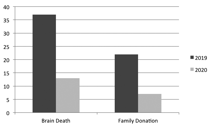 All patients diagnosed with brain death were included in the study. The effects of the COVID-19 pandemic in 2020 in Turkey started in March and it was felt severely in May. We have counted the number of brain deaths and organ donations for these months. We retrospectively compared the same months in 2019, the months before and after the pandemic in 2020, and the years 2019-2020. Diagnosis of death was confirmed by strict adherence to standardized clinical, neurologic, and supplementary test in accordance with Turkish law and related guidelines. Since the study was about COVID-19, permission was also obtained from the ministry of health