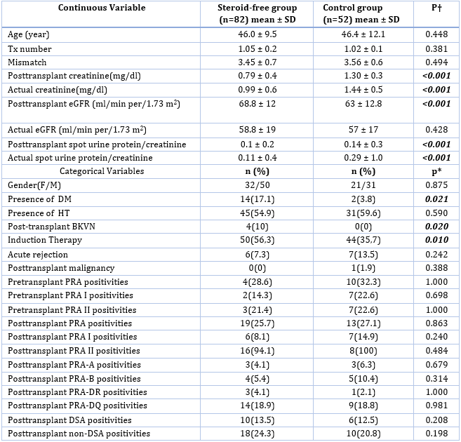 Abstract: Background: Steroids are the mainstream drugs of immunosuppressive regimen in renal transplantation. They are successfully used on induction, maintenance and rejection treatment. Due to complications caused by steroids, treatments are switched to immunosuppressive agents. Graft dysfunction risk caused by reduced total immunosuppression disturbs clinicians very often. We documented the differences among patients by means of clinical presentation and PRA/DSA levels between patients who are using steroids and patients that were prescribed for steroid-free regimen. Methods: 82 individuals who did not use steroid and 52 patients on steroid treatment were included with similar rates of age, sex, primary renal disease, dialysis type, posttransplant follow-up duration and donor type. Pre and posttransplant PRA, DSA levels, posttransplant and current graft function and comorbidities were evaluated. Results: Individuals who do not use steroids were found to have a lower posttransplant creatinine level and glomerular filtration rate (GFR) compared to steroid users. Posttransplant and current spot urinary protein/creatinine rates were also lower in the steroid-free group. However DM, BKVN and induction therapy rates were higher in the steroid-free group. PRA and DSA levels were similar in both groups. On the other hand, posttransplant PRA-I levels were significantly higher in those with less steroid use time. Conclusions: Although steroid free regimens usually worry the clinicians, they can be preferred in patients with low immunological risk for rejection to avoid its side effects such as uncontrolled diabetes, obesity, musculoskeletal problems and cataracts.