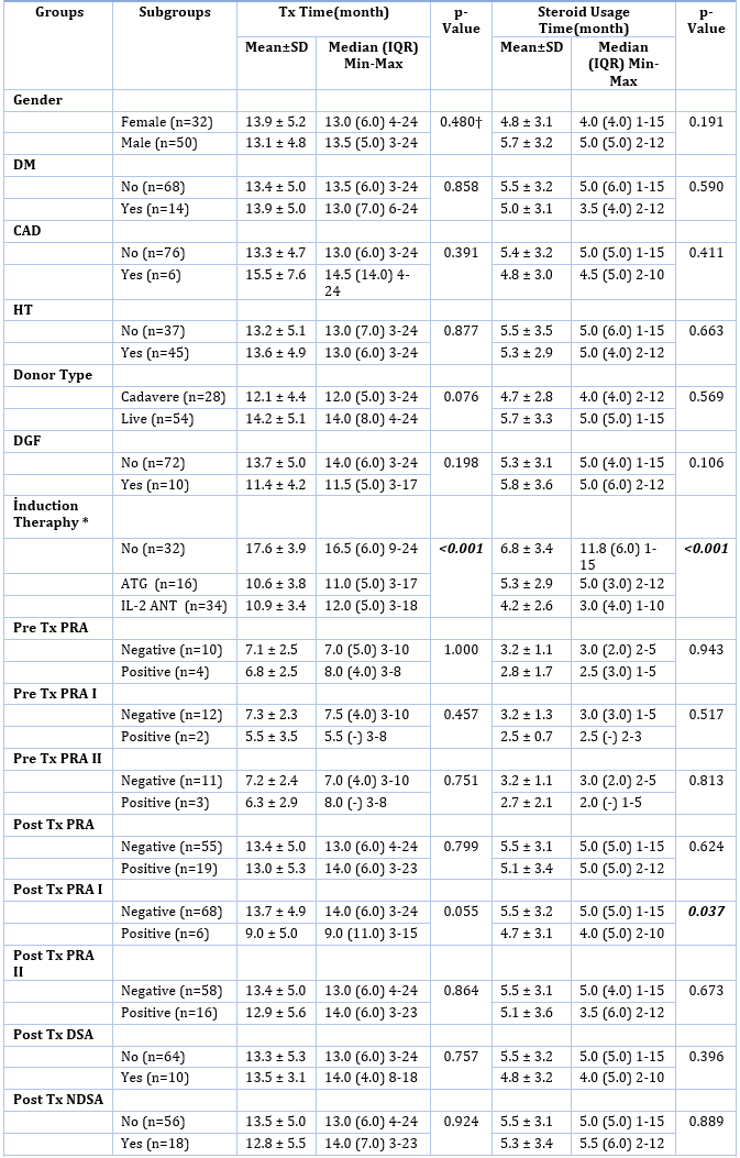 Transplant time and steroid use duration were compared with other parameters in Table 2. Transplant time and steroid use duration were significantly different in those who had received induction therapy. It was observed that those who received induction therapy had shorter transplant and steroid use times. Posttransplant PRA I positivity was found to be more significant for those with shorter steroid use duration.