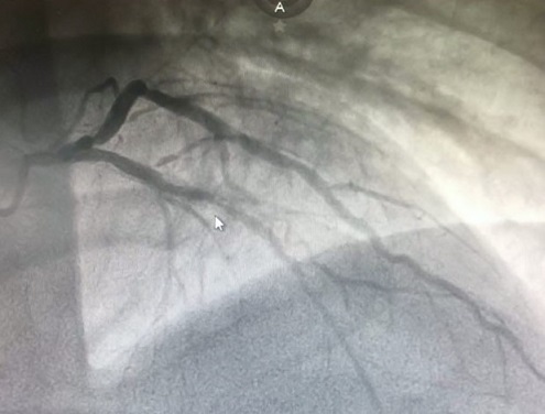 Durante el transoperatorio los fármacos empleados fueron clopidogrel 300mg., heparina 6000 UI/IV, isosorbide 400mcg/intracoronario. Anestésicos: fentanilo 100 mcg/IV, adyuvantes: paracetamol 1 gr/IV. Mantenimiento 02 FiO2 40%. Tiempo quirúrgico: 60 minutos y medio de contraste 70 ml. Posteriormente, fue trasladado a la Unidad de Terapia Intermedia (UTI), durante la hospitalización se mantuvo con antiagregantes plaquetarios, b-bloqueantes, estatinas y continuando con su terapia dialítica. Permaneciendo hemodinámicamente estable sin deterioro de la función cardiaca, fue dado de alta a su domicilio después de tres días de hospitalización en UTI y ocho días en Medicina Interna, en favorables condiciones clínicas. El paciente actualmente se encuentra en lista de espera para TxR.