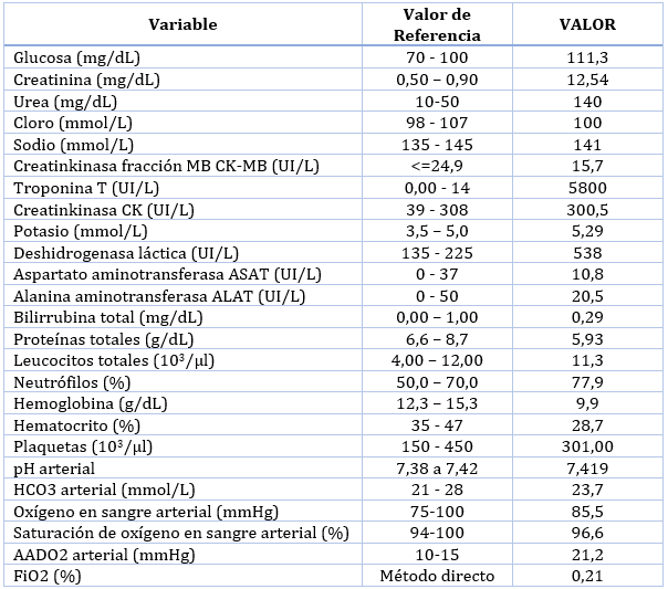 Inicia su padecimiento actual, una semana previa a su ingreso presentando dolor precordial tipo opresivo EVA 3/10, sin irradiaciones, factores exacerbantes o atenuantes; motivo por el cual acude a Urgencias y es tratado como un cuadro de insuficiencia cardiaca descompensada por mal apego a tratamiento farmacológico y terapia dialítica. Se egresa de urgencias y es enviado a domicilio donde persiste con dolor precordial intermitente, motivo por el cual decide acudir a Hospital General de “La Raza”, por estar en protocolo de TxR en fase de estudio de donante (vivo no relacionado). Al llegar a la Unidad, presenta dolor precordial tipo opresivo EVA 7/10, acompañado de diaforesis, disnea de pequeños esfuerzos, ortopnea, edema de miembros inferiores. Sus signos vitales eran pO2 96%, TA 148/84 mmHg, FC 80 x min, temperatura de 36,2°C, FR 18 x min, IMC: 36,4; superficie corporal de 2,03 m2. Exámenes de laboratorio se detallan en la Tabla 1.