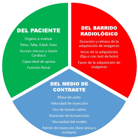 Los factores determinantes para obtener un adecuado contraste imagenológico son variados y particulares para cada examen, interaccionando entre sí (Figura 1). El grado de realce del contraste está directamente relacionado con la cantidad de yodo aportado (concentración, volumen, tasa de inyección), el nivel de energía aportada (voltaje del tubo), así como también de las características del paciente y de la patología a estudiar.