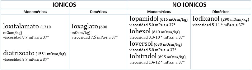 Los medios de contraste yodados (MCY) intravasculares de mayor uso clínico corresponden a aquellos que derivan del ácido triyodo benzoico. Históricamente, han sido iónicos y de alta osmolalidad (usualmente 4-5 veces la plasmática), característica que se relaciona directamente con la hidrosolubilidad del agente, determinando la carga osmótica (Tabla 1).(3)