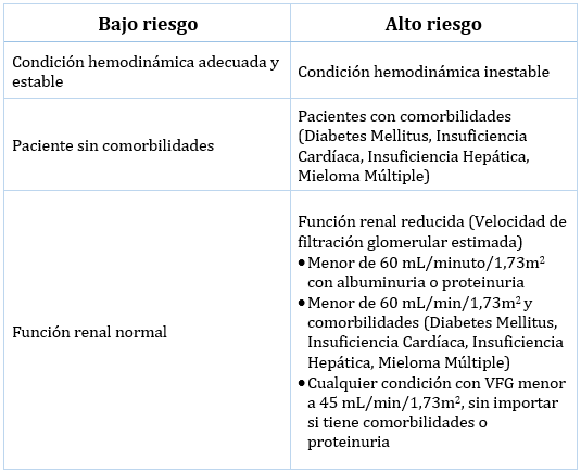 Para los pacientes en riesgo (Tabla 2) que requieran imprescindiblemente un estudio contrastado para su manejo, se recomienda el uso de solución salina al 0,9% (suero fisiológico) por vía intravenosa, siempre que no haya una contraindicación a la expansión de volumen. Los esquemas propuestos son los siguientes: