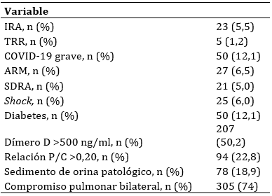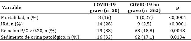 Ingresaron al estudio 412 pacientes, el 57% fue del sexo masculino y la media de edad fue 51 ± 16 años. En el 40% de los casos, la fiebre y tos fue la forma de presentación de COVID-19 al ingreso al hospital. La mediana de estadía hospitalaria fue de 6 días con un rango intercuartilo entre 4 y 10 días. En cuanto a las comorbilidades medidas por el score de Charlson, el 20% tuvo un valor ≥3. Cincuenta (12,1%) presentaron un cuadro grave de COVID-19 en la evolución de la internación, de los cuales 25 requirieron internación en terapia intensiva. La incidencia de IRA en la internación fue 5,5% (n=23) de los cuales 5 (1,21%) requirieron TRR (Tabla 1). Su distribución según los estadios de IRA fue: diez individuos en estadio 1, cuatro en estadio 2 y nueve en estadio 3. La mortalidad hospitalaria fue 2,2% (n=9). Más de la mitad de los pacientes que desarrollaron COVID-19 grave tuvieron sedimento de orina patológico y/o relación proteinuria/creatininuria >0,20 al ingreso al hospital. (Tabla 2)