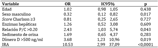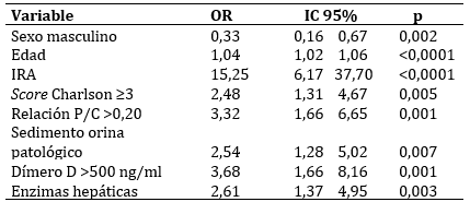 El análisis bivariado (Tabla 3) y multivariado (Tabla 4) mostró que el sexo masculino, dímero D >500 ng/ml, relación proteinuria/creatininuria >0,20 e IRA fueron predictores de COVID-19 grave en la internación. El análisis bivariado de mortalidad mostró una asociación significativa con el desarrollo de COVID-19 grave [OR = 68,76 (IC 8,39-563,35), p<0,0001] e IRA [OR= 45,4 (IC 10,45-197,22), p<0,0001].