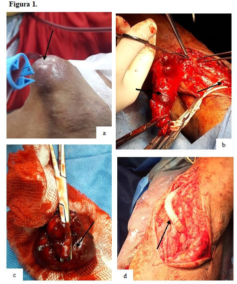 Primera cirugía: Se realizó asepsia y antisepsia de brazo izquierdo, colocación de campos quirúrgicos. Se infiltran 20 mililitros de lidocaína alrededor de la masa pulsátil, además de sedación endovenosa por parte del servicio de anestesia. Se practica control proximal y distal de la arteria humeral, exéresis del PSA y reparación de la arteria con parche de la misma vena cefálica izquierda sana. Como no se identificaron elementos infecciosos en el sitio quirúrgico, se realizó interposición de prótesis politetrafluoroetileno (PTFE) desde la arteria humeral (más proximal a la fístula previa) a la vena basílica izquierda (Figura 1. b, c, d). El paciente evolucionó favorablemente y se egresó a las 48 horas de la cirugía. Según su unidad se dializó mediante catéter yugular derecho, aunque se procedió a utilizar la prótesis en forma precoz, por mal funcionamiento de este, además de la inconformidad referida por el paciente con los catéteres.