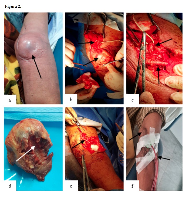 Segunda cirugía: se practicó método de anestesia regional (bloqueo de plexo axilar izquierdo) previa administración de 500 mg de vancomicina endovenosa. Se realizó asepsia y antisepsia de brazo izquierdo, colocación de campos quirúrgicos. Se practicó control proximal y distal de la arteria humeral, se disecó la masa pulsátil (Figura 2. b) y se encontró hematoma crónico, de aspecto granulomatoso alrededor, de la prótesis (Figura 2. c y d). Se procedió a extraer la prótesis de PTFE y reparar la arteria humeral con parche de vena safena y se interpusieron 8 centímetros de vena safena invertida entre arteria humeral (2 cm más distal de antigua anastomosis con la prótesis) y vena basílica más proximal, resecando la zona dilatada de la vena (Figura 2. e). Se revisó hemostasia y cierre por planos, sin complicaciones durante el procedimiento.