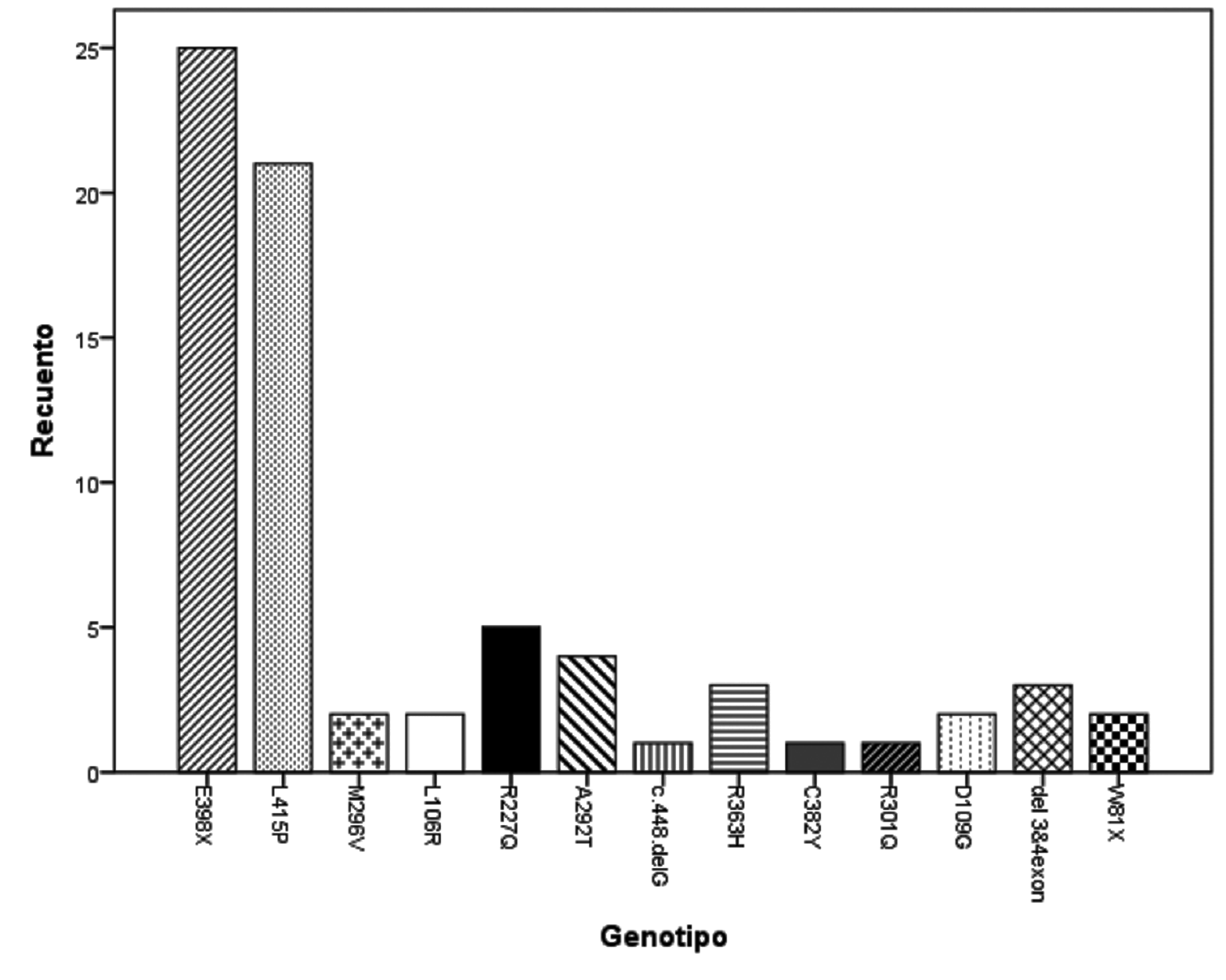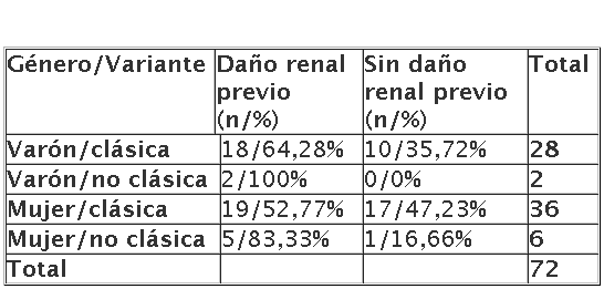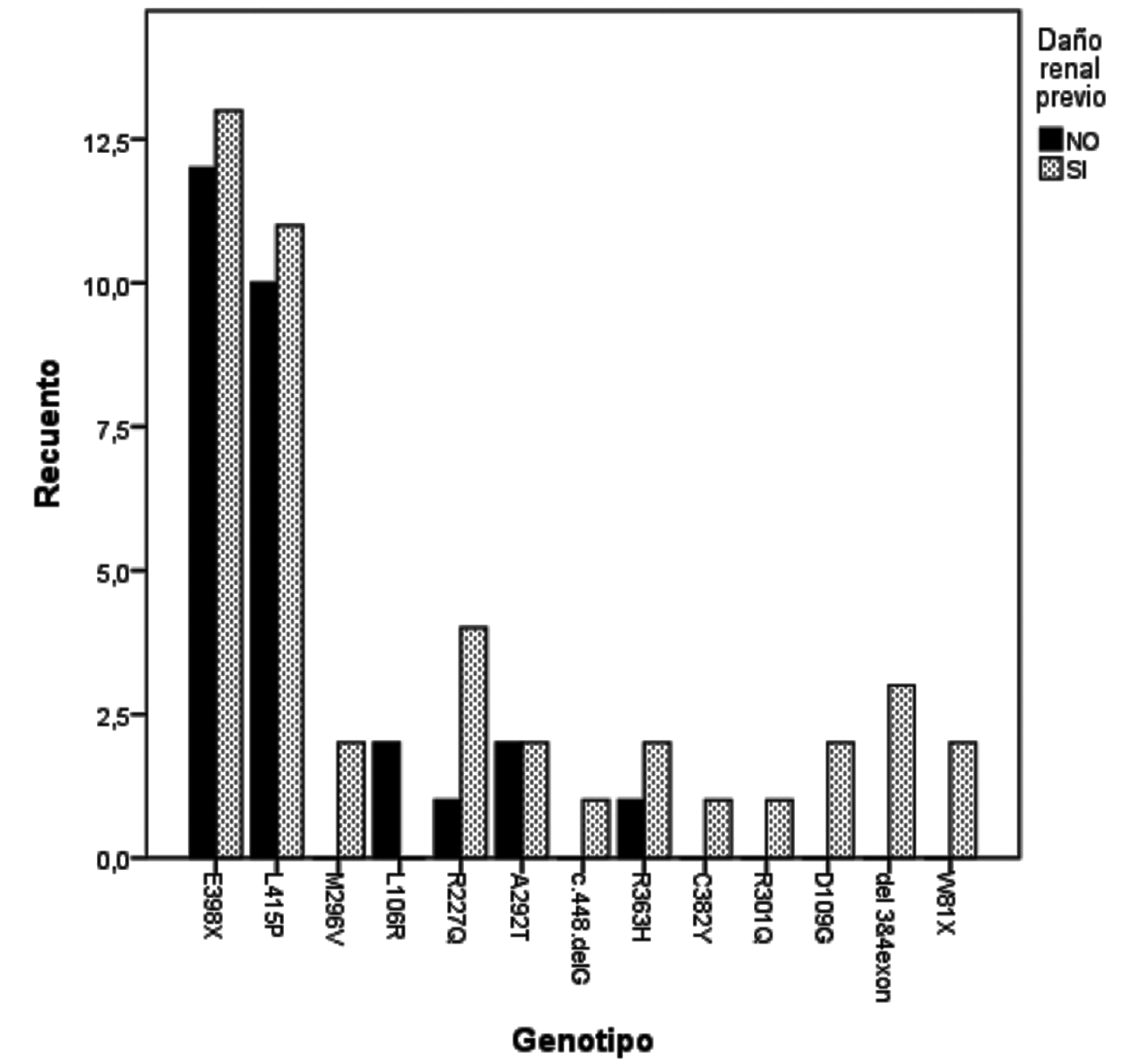 Se incluyeron datos de la primera consulta de 72 pacientes con EF; 44 pacientes, el 61,1% de la población incluida en el estudio, presentó daño renal previo al diagnóstico de EF (Tabla 1). LaTabla 2 muestra las características demográficas y la frecuencia de daño renal previo al diagnóstico de la población en estudio. Pacientes con 9 mutaciones “clásicas” (E398X, L415P, L106R, R227Q, A292T, c.448.delG, C382Y, del 3&4exon, W81X) y 4 mutaciones “variante tardía” (M296V, R363H, R301Q, D109G) del gen GLA fueron estudiados. En el Gráfico 1 se observa la distribución de frecuencias según genotipo de los sujetos en estudio.