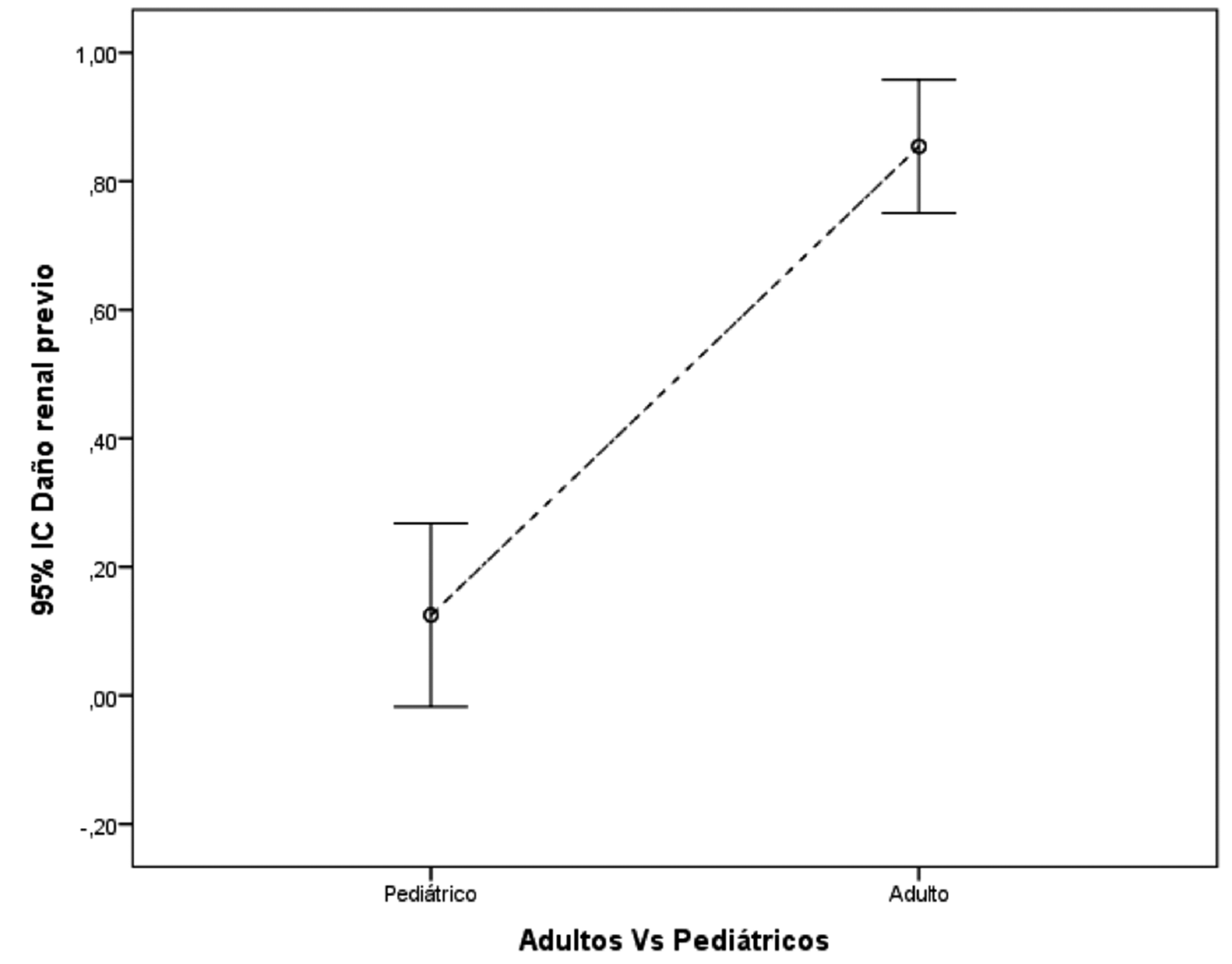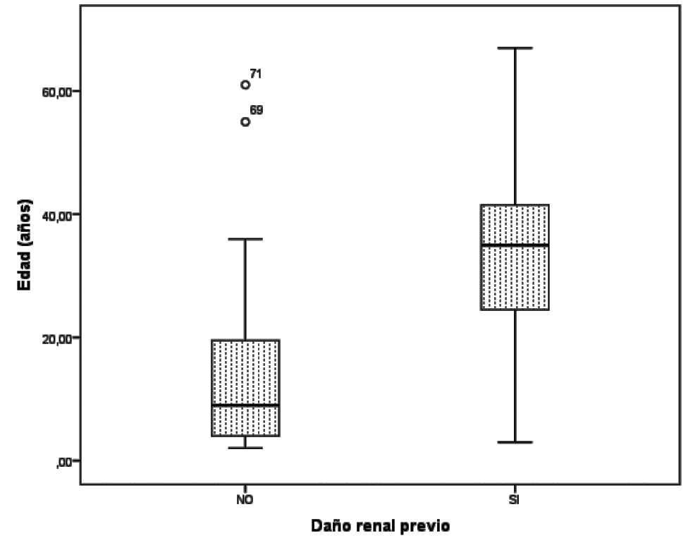 Las variables independientes que se correlacionaron con significancia estadística a “daño renal previo” fueron la edad (p=<0,001, Gráfico 2), el genotipo (p=0,009, Gráfico 3) y el ser diagnosticado en edad adulta (p=<0,001, Gráfico 4). No se encontró correlación entre daño renal previo y las siguientes variables independientes: género (p=0,421), ser caso índice (p=0,139), el tipo de variante (clásica/tardía) de la EF (p=0,107) y la actividad enzimática αGalA (p=0,916).
